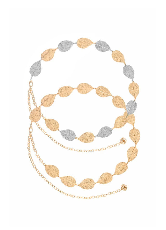 Cinto ajustável em corrente metálica com aplicação de folhas texturizadas em metal . Leve, versátil e com fecho regulável, é perfeito para valorizar a silhueta com um toque elegante e natural.